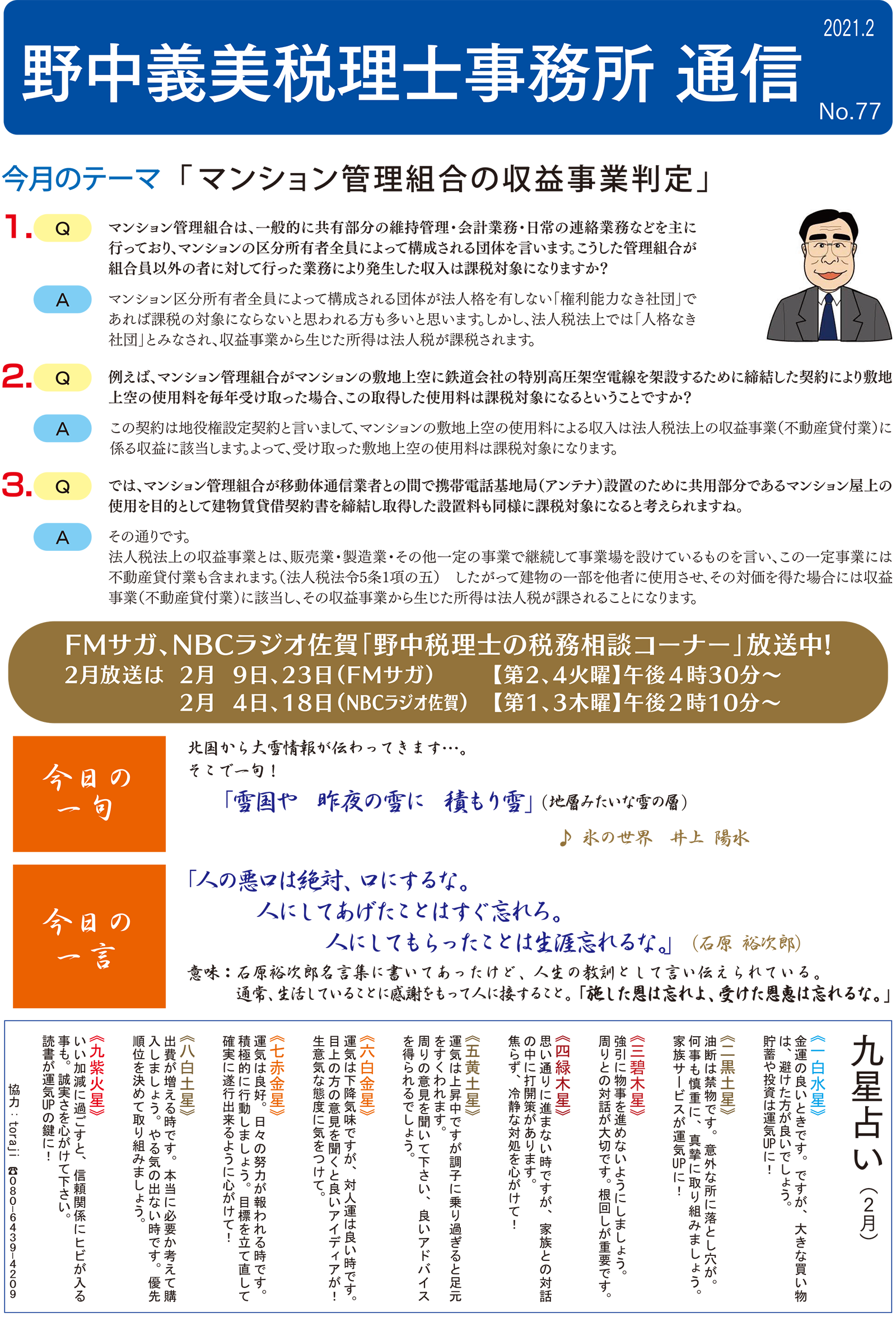 今月のテーマ「マンションの管理組合の収益事業判定」 PDFからご覧いただけます 野中税理士事務所通信 野中税理士事務所通信 No.76 野中税理士事務所通信 No.78 関連記事 野中税理士事務所通信 No.135 2026年2月3日 野中税理士事務所通信 No.134 2025年12月26日 野中税理士事務所通信 No.133 2025年11月28日 野中税理士事務所通信 No.132 2025年11月6日 野中税理士事務所通信 No.131 2025年10月3日 野中税理士事務所通信 No.130 2025年8月30日 野中税理士事務所通信 No.129 2025年8月8日 野中税理士事務所通信 No.128 2025年7月7日