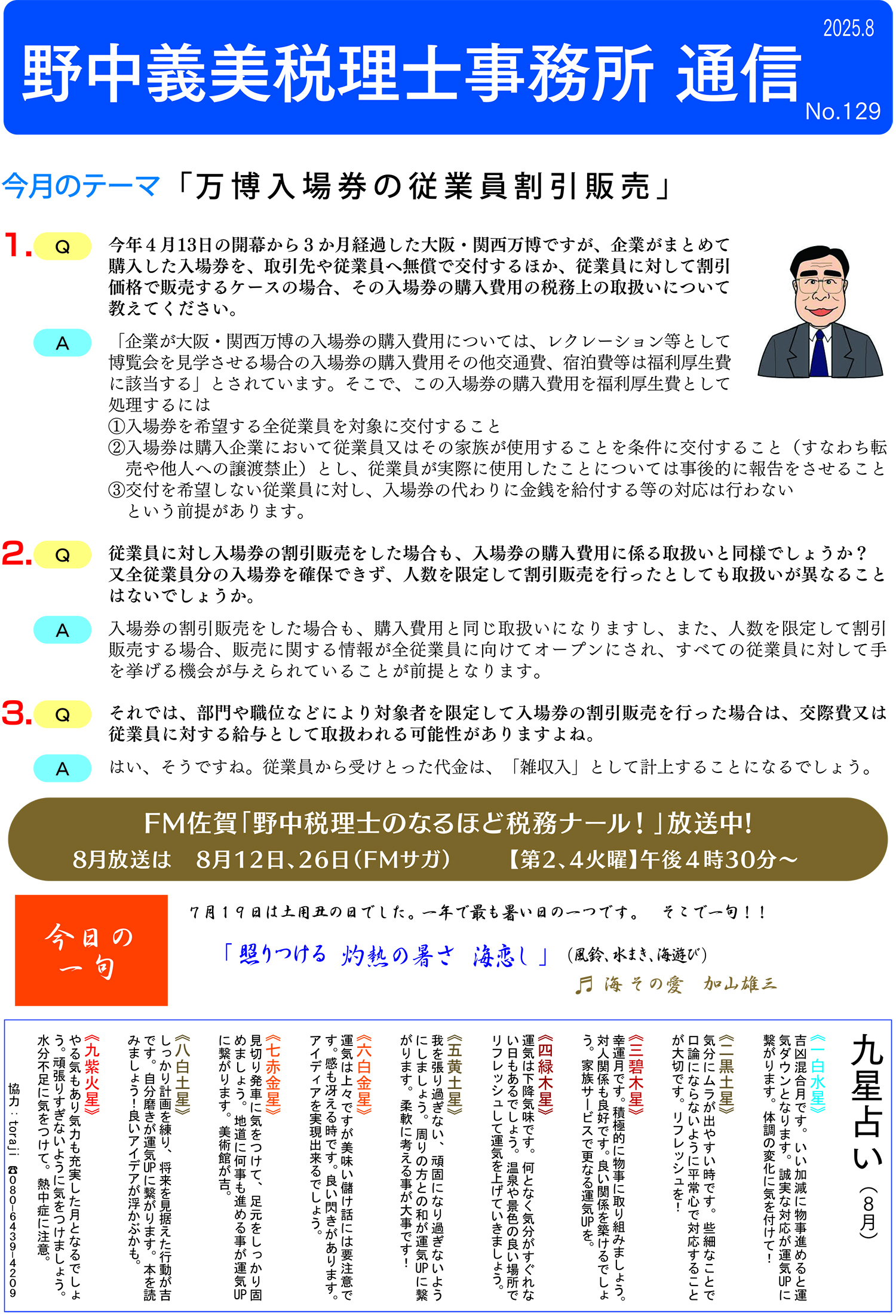 今月のテーマ「万博入場券の従業員割引販売」 PDFからご覧いただけます 野中税理士事務所通信 FMSAGA 2025.06.24放送分 野中税理士事務所通信 No.130 関連記事 野中税理士事務所通信 No.135 2026年2月3日 野中税理士事務所通信 No.134 2025年12月26日 野中税理士事務所通信 No.133 2025年11月28日 野中税理士事務所通信 No.132 2025年11月6日 野中税理士事務所通信 No.131 2025年10月3日 野中税理士事務所通信 No.130 2025年8月30日 野中税理士事務所通信 No.128 2025年7月7日 野中税理士事務所通信 No.127 2025年6月1日